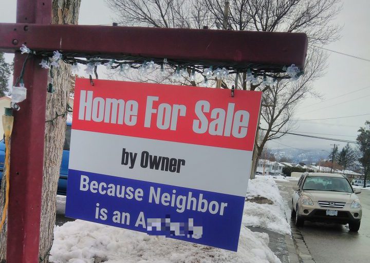 Neighbors in a Kelowna community are reacting to an unconventional `for sale’ sign at a house that has gone on the market because the homeowners claim they are fed up with a neighbour.