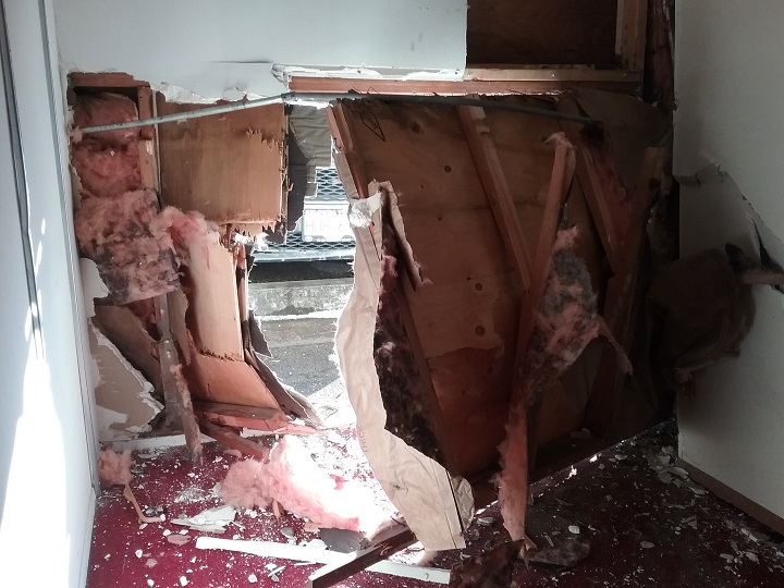 Another look from inside Cruzwear Unlimited at the damage the car did when it hit the rear wall.